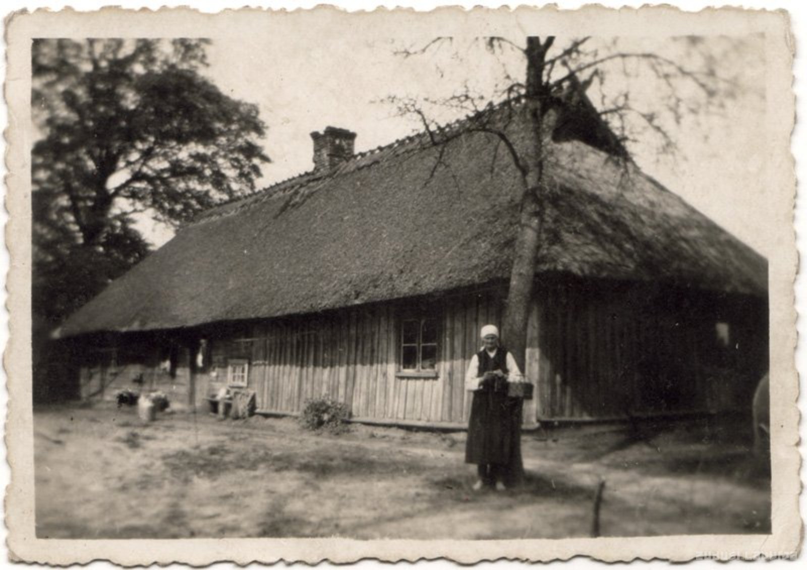 Lauku māja ar "tupelītēm" jumta korē, brodiņiem un sakrustotām zirtu galvām jumtgalē. Lauku sietvietes portrets ar grozu