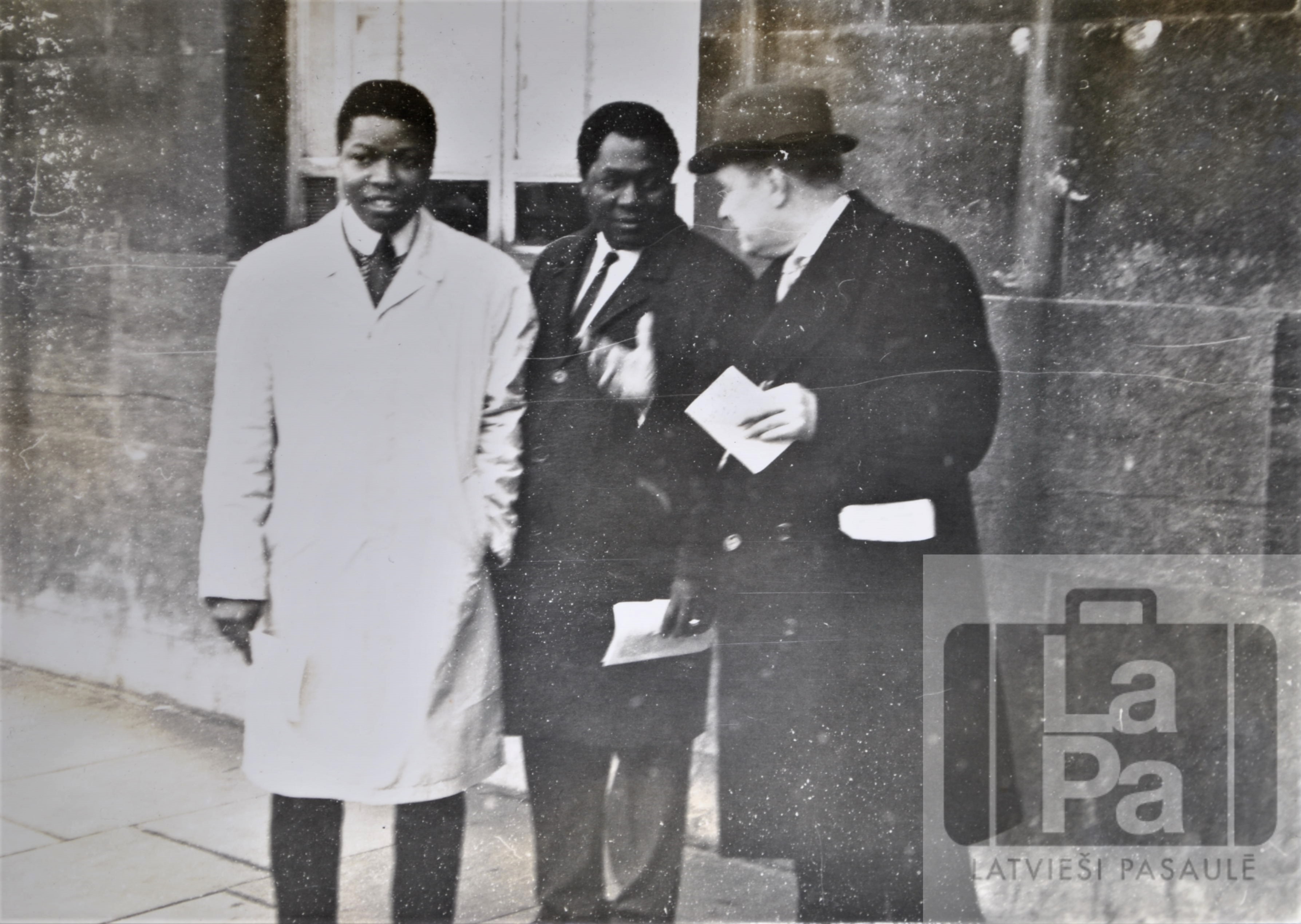 Latviešu žurnālists Jūlijs Vaivars stāsta Āfrikas studentiem par Līdsā notiekošās demonstrācijas nozīmi. Demonstrācija norisa Padomju Savienības vēstnieka Lielbritānijā Soldātova viesošanās laikā.