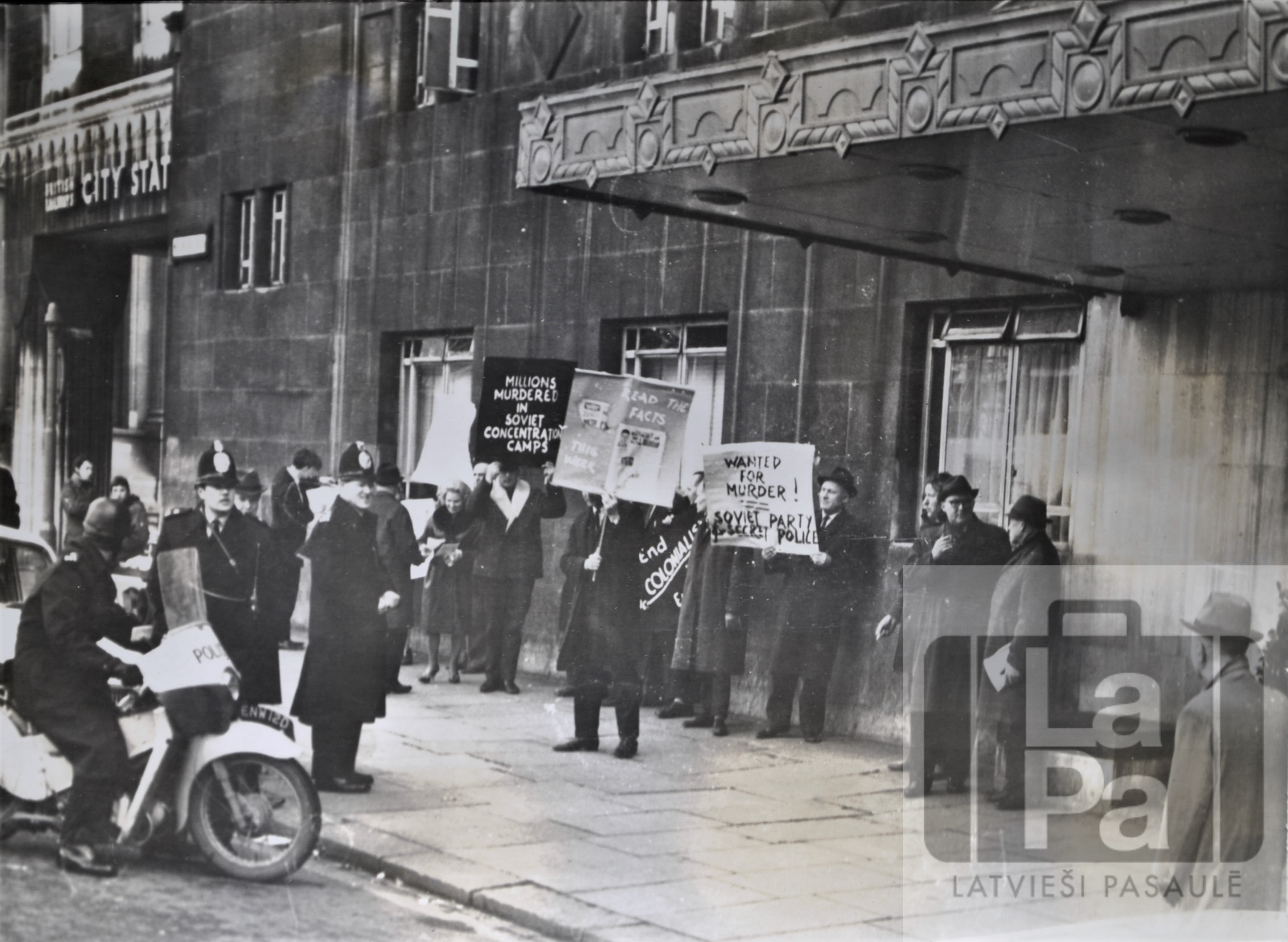 Demonstrācija pie Karalienes viesnīcas Līdsā, kur bija apmeties PSRS vēstnieks Lielbritānijā Soldātovs. Vēstnieks bija ieradies, lai atklātu Padomju Savienības nedēļu, kurā bija apskatāma arī Latvijas PSR amatieru mākslas izstāde.