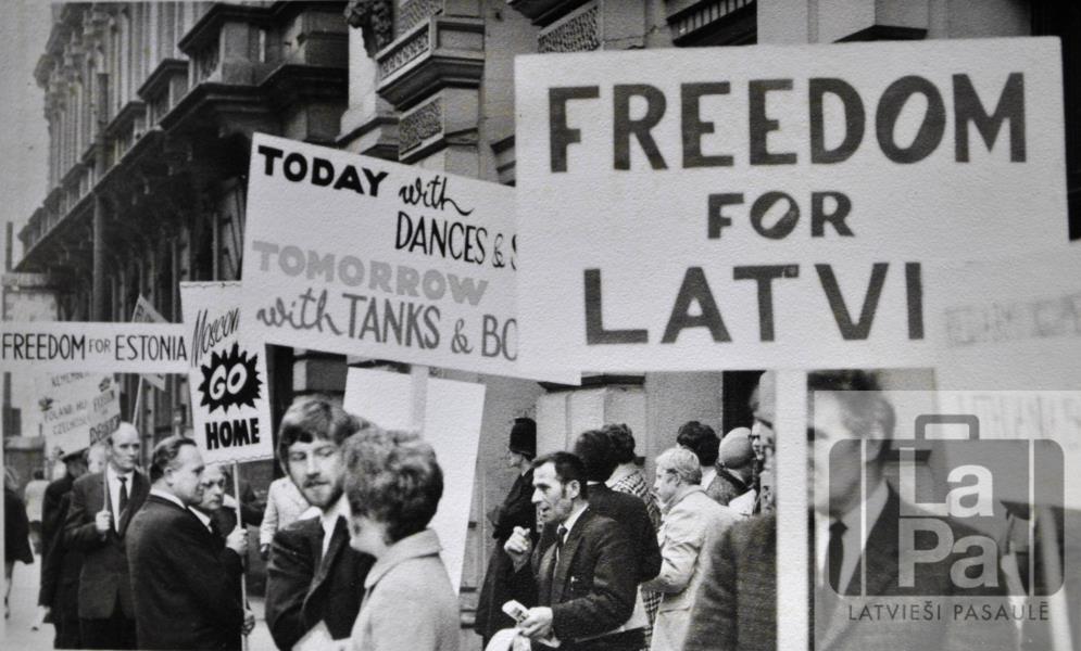 Daugavas Vanagu fonda Bredfordas nodaļas biedri un citi baltieši protestē pret Sarkanās armijas deju ansambļa viesošanos Anglijā.