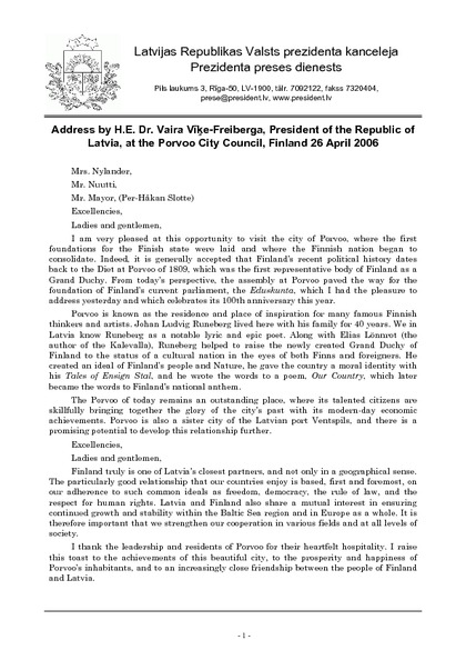 Address by H.E. Dr. Vaira Vīķe-Freiberga, President of the Republic of Latvia, at the Porvoo City Council, Finland 26 April 2006