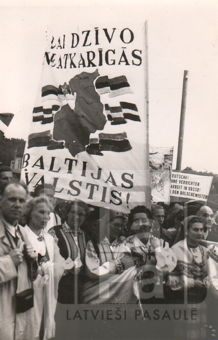 Latviešu bēgļi piedalās pretpadomju demonstrācija Cufenhauzenā pie Štutgartes Vācijā. Šajā demonstrācijā piedalījās tūkstošiem bēgļu no vairākām bēgļu nometnēm.