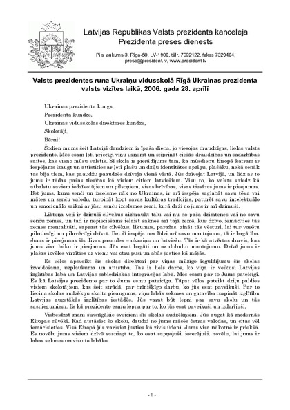 Valsts prezidentes runa Ukraiņu vidusskolā Rīgā Ukrainas prezidenta valsts vizītes laikā, 2006. gada 28. aprīlī