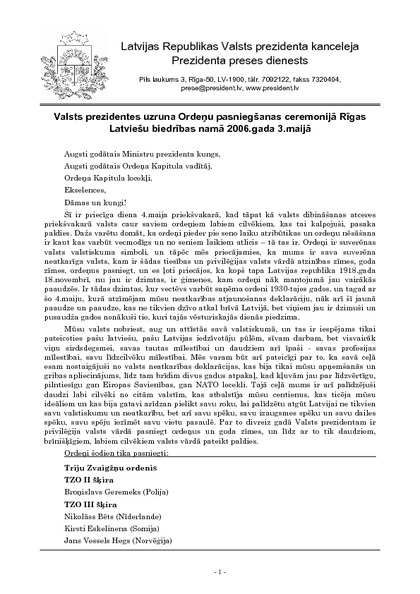 Valsts prezidentes uzruna Ordeņu pasniegšanas ceremonijā Rīgas Latviešu biedrības namā 2006.gada 3.maijā