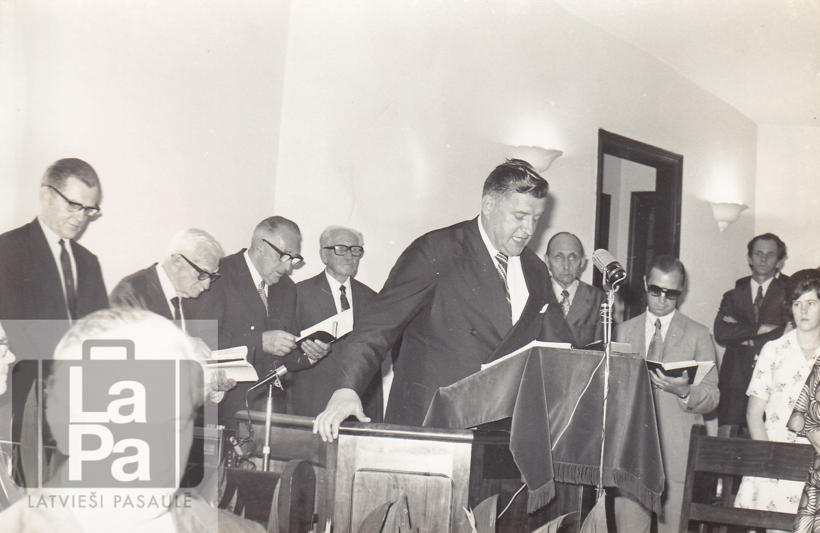 Sanpaulu latviešu baptistu draudzes 40 gadu jubileja 1974. gada 27. oktobrī. Pie mikrofona diriģents Gunārs Tīss. Aizmugurē no kreisās: 1. Andrejs Arājs (?), 2. Kārlis Rūdolfs Andermanis, 3. Jānis (Žanis) Lukašs, 4. Jānis Augstroze, 5. Andrejs Ceruks.