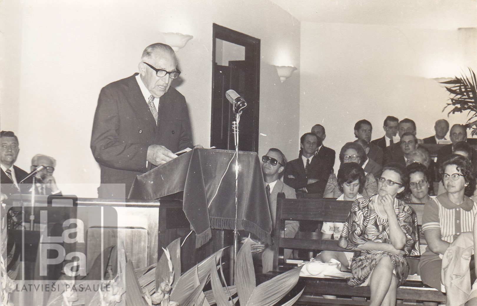 Sanpaulu latviešu baptistu draudzes 40 gadu jubileja 1974. gada 27. oktobrī. Pie mikrofona Jānis (Žanis) Lukašs.
