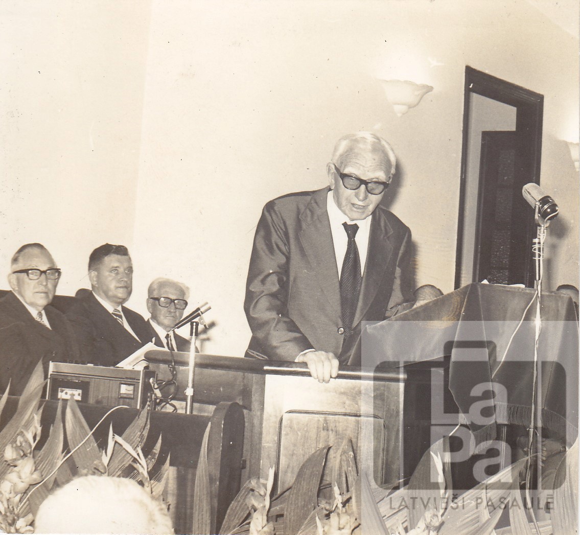 Sanpaulu latviešu baptistu draudzes 40 gadu jubileja 1974. gada 27. oktobrī. Pie mikrofona Kārlis Rūdolfs Andermanis.