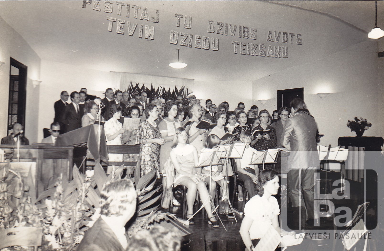 Sanpaulu latviešu baptistu draudzes 40 gadu jubileja 1974. gada 27. oktobrī. Jubilejas kopkoris (dziedātāji no Sanpaulu, Novaodesas I un II baptistu draudzes) ar diriģentu.