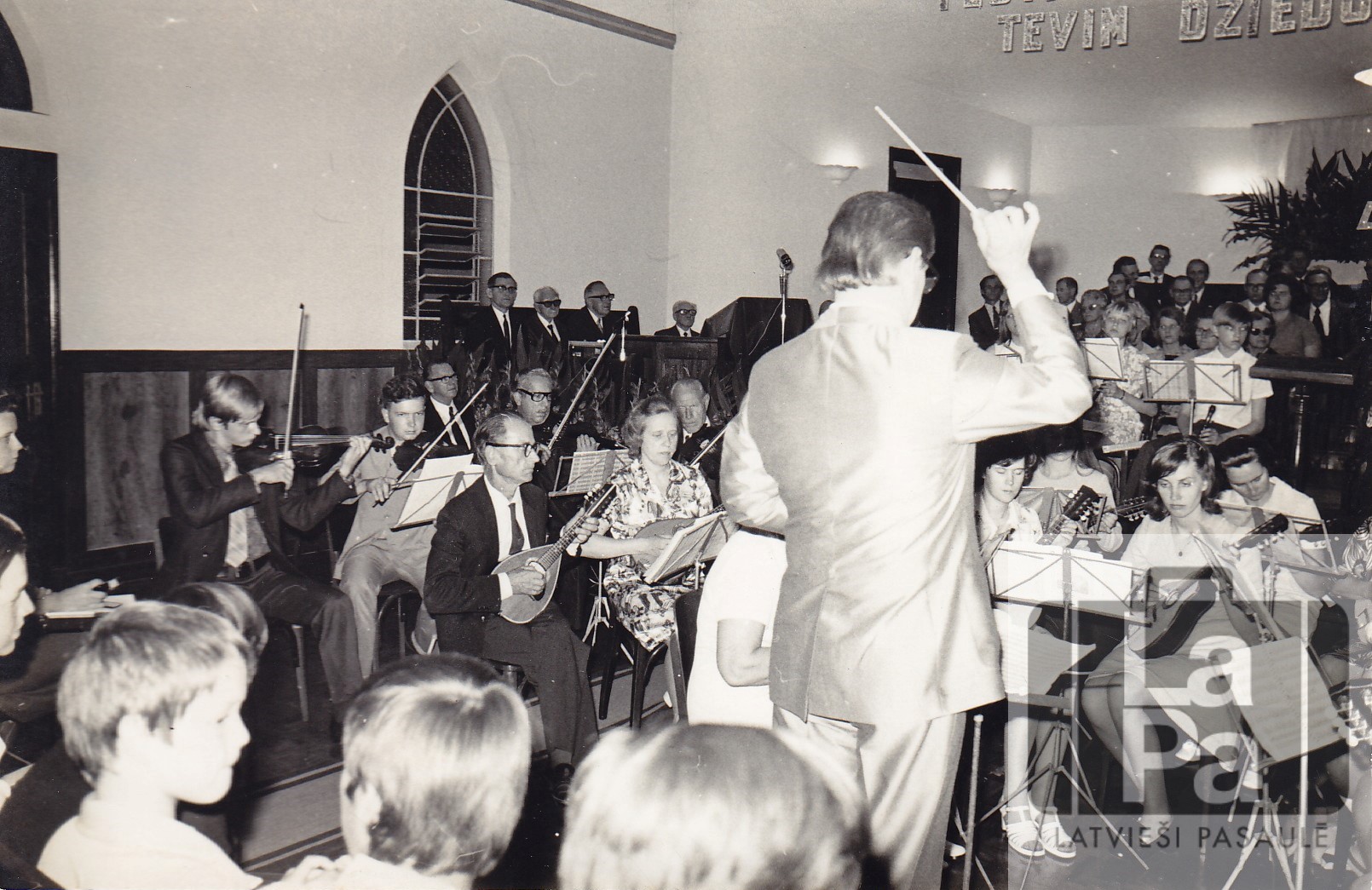 Sanpaulu latviešu baptistu draudzes 40 gadu jubileja 1974. gada 27. oktobrī. Jubilejas kopkoris un orķestris (dziedātāji no Sanpaulu, Novaodesas I un II baptistu draudzes) ar diriģentu.
