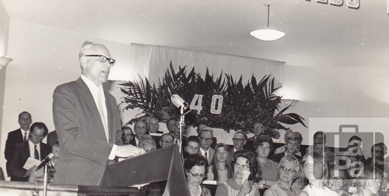 Sanpaulu latviešu baptistu draudzes 40 gadu jubileja 1974. gada 27. oktobrī. Pie mikrofona Jēkabs Mekšs, Sanpaulu latviešu evanģēliski luteriskās draudzes mācītājs.