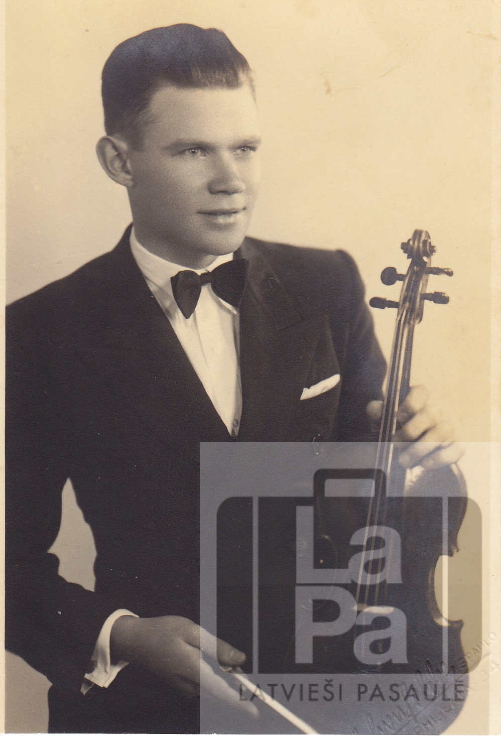 Sanpaulu latviešu baptistu draudzes kora diriģents Kārlis Purgailis ar vijoli. Otrā pusē rokrakstā: "Emīlijai un Žanim Sproģim atcerei atstāj K. Purgailis. S.Paulā, 27–7–37."