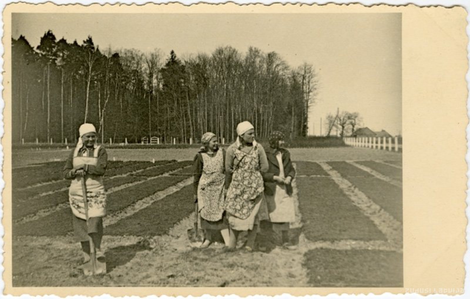 Strādnieces ar lāpstām ierīko dārzu Kursīšos