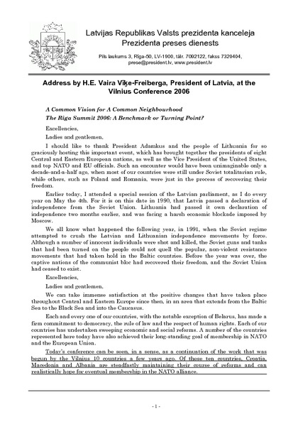 Address by H.E. Vaira Vīķe-Freiberga, President of Latvia, at the Vilnius Conference 2006