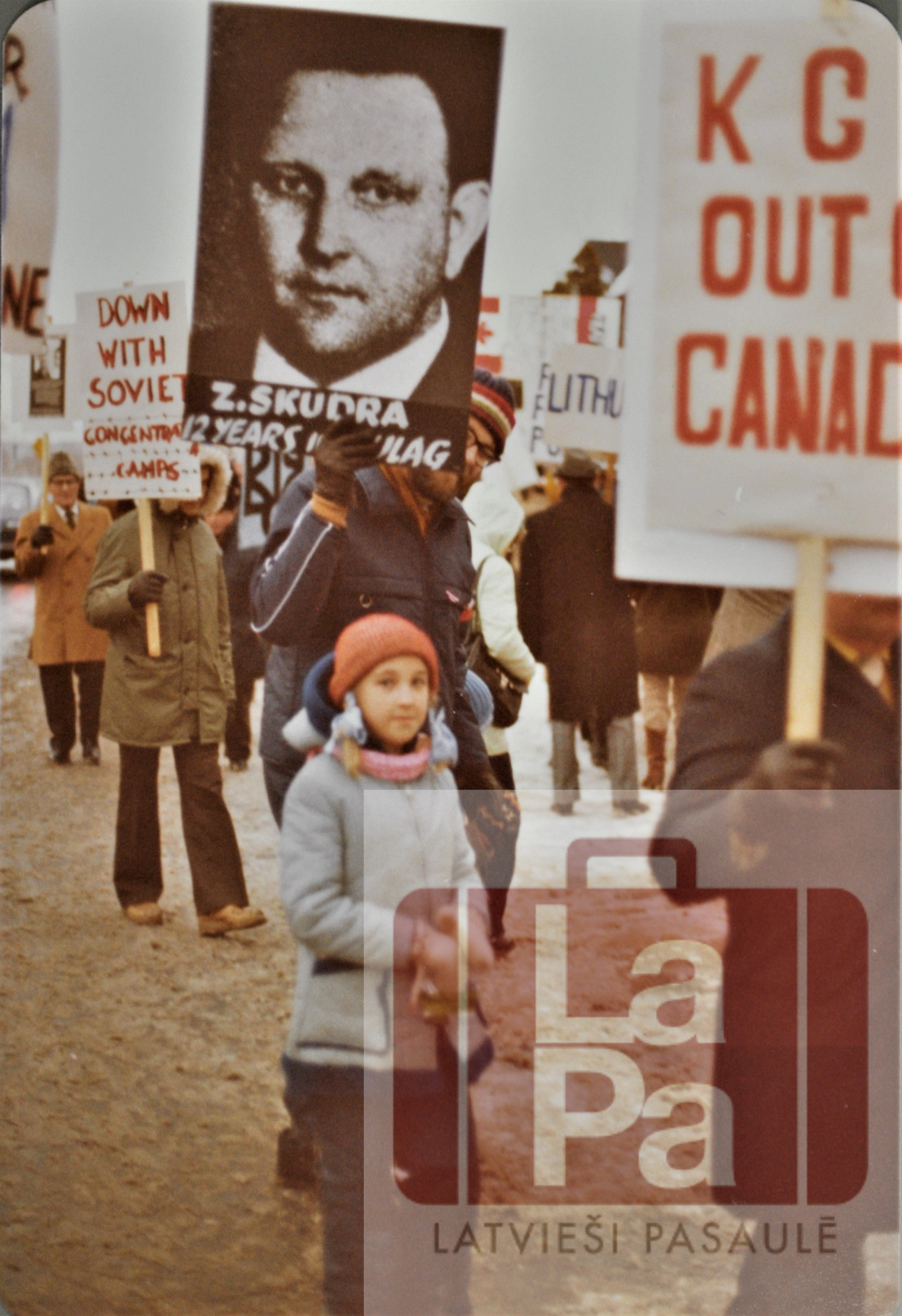 Pretpadomju demonstrācija Otavā, Kanādā, pie PSRS vēstniecības kopā ar citiem baltiešiem un ukraiņiem. Aiz Z. Skudras plakāta - Jānis Galdiņš, priekšā meita Laura.