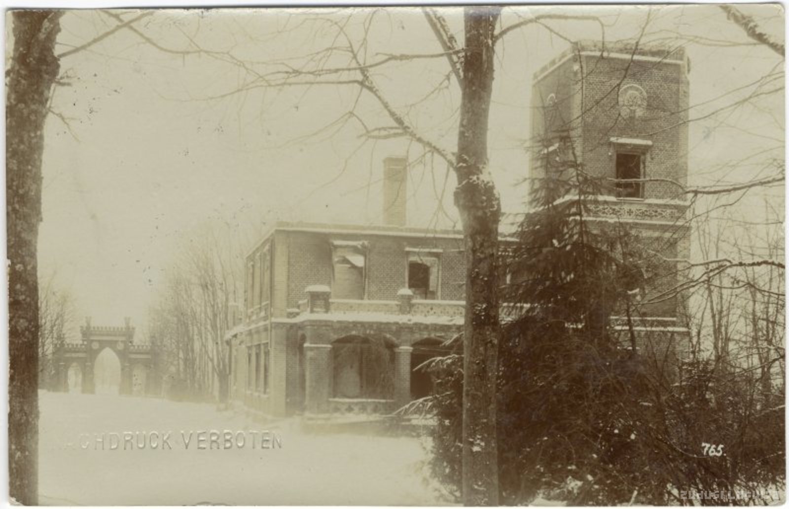 Vecgulbenes Jaunā jeb Sarkanā pils, kas atrodas uz dienvidaustrumiem no Vecgulbenes Baltās (vecā) pils. Celta 19. gadsimta otrajā pusē ķieģeļu neogotikas stilā pēc barona Heinriha fon Volfa pasūtījuma viņa sievai Marijai (Marisai). Kreisajā stūrī ir redzami tādā pašā stilā veidoti ķieģeļu vārti, kas ved uz parku. Pilij ir neogotikas stilam raksturīgs kvadrātveida tornis, rotāts ar zobinājumu un skulptūrām nišās. Fasādi rotā detikulu parapets, četrlapju (gotisko rožu) frīze u. c. neogotikas dekoratīvie elementi. Attēls uzņemts drīz pēc 1905. gada nemieriem, tāpēc tajā redzami pilij nodarītie bojājumi. Pils tika daļēji atjaunota, mainot telpu plānojumu, attēlā redzamajam skatu tornim daļa no logu ailām aizmūrētas u.c. Pils palika fon Volfu dzimtas īpašumā līdz 1920. gadam, pēc tam piedzīvoja vēl vienu pārbūvi, jo to pielāgoja skolas vajadzībām. 20. gadsimta 70. gados skolas vajadzībām ēkai uzcelta piebūve. Mūsdienās ēkā atrodas pamatskola un tā ir ieguvusi vietējas nozīmes arhitektūras pieminekļa statusu.