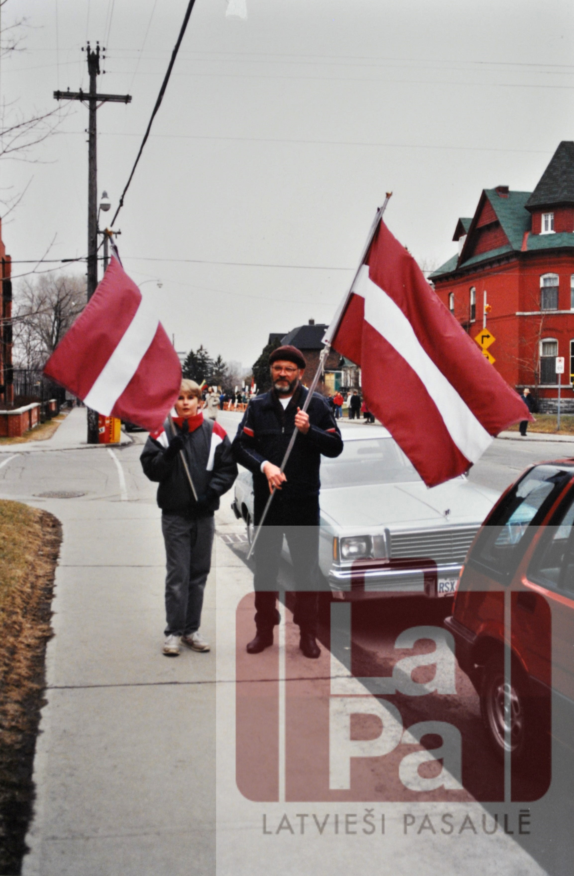 Jānis Galdiņš un dēls Roberts netālu no PSRS vēstniecības, kur tālumā ir redzama pretpadomju demonstrācija, 20.gadsimta 80. gadu beigas.