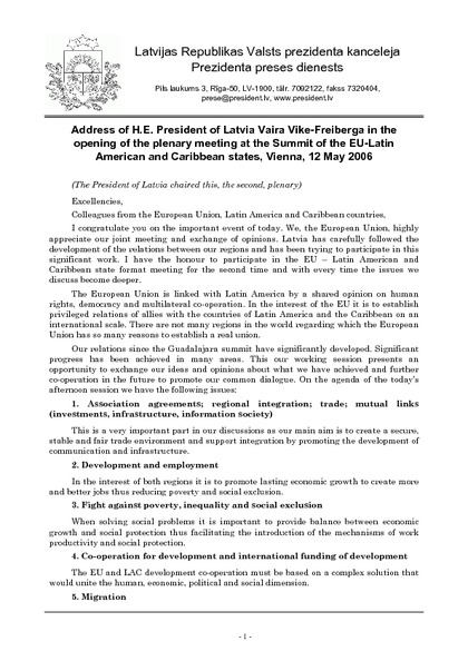 Address of H.E. President of Latvia Vaira Vike-Freiberga in the opening of the plenary meeting at the Summit of the EU-Latin American and Caribbean states, Vienna, 12 May 2006