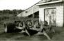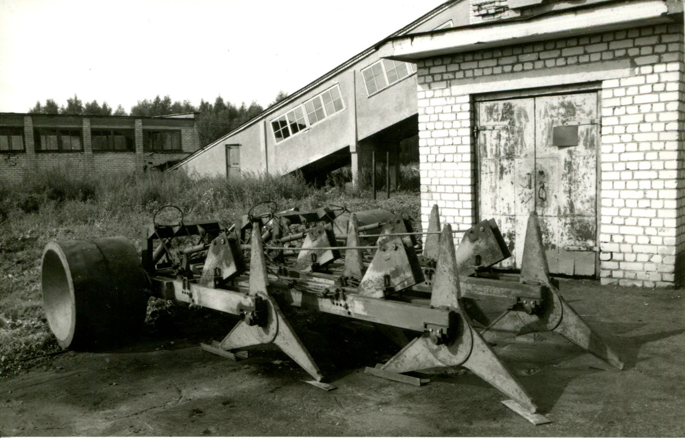 Pie vecā brikešu ceha redzams atcelmotājs. Tādus ražoja eksperimentālā iecirknī, Baložu kūdras fabrikā. Fonā redzams kūdras izkraušanas iecirknis.
