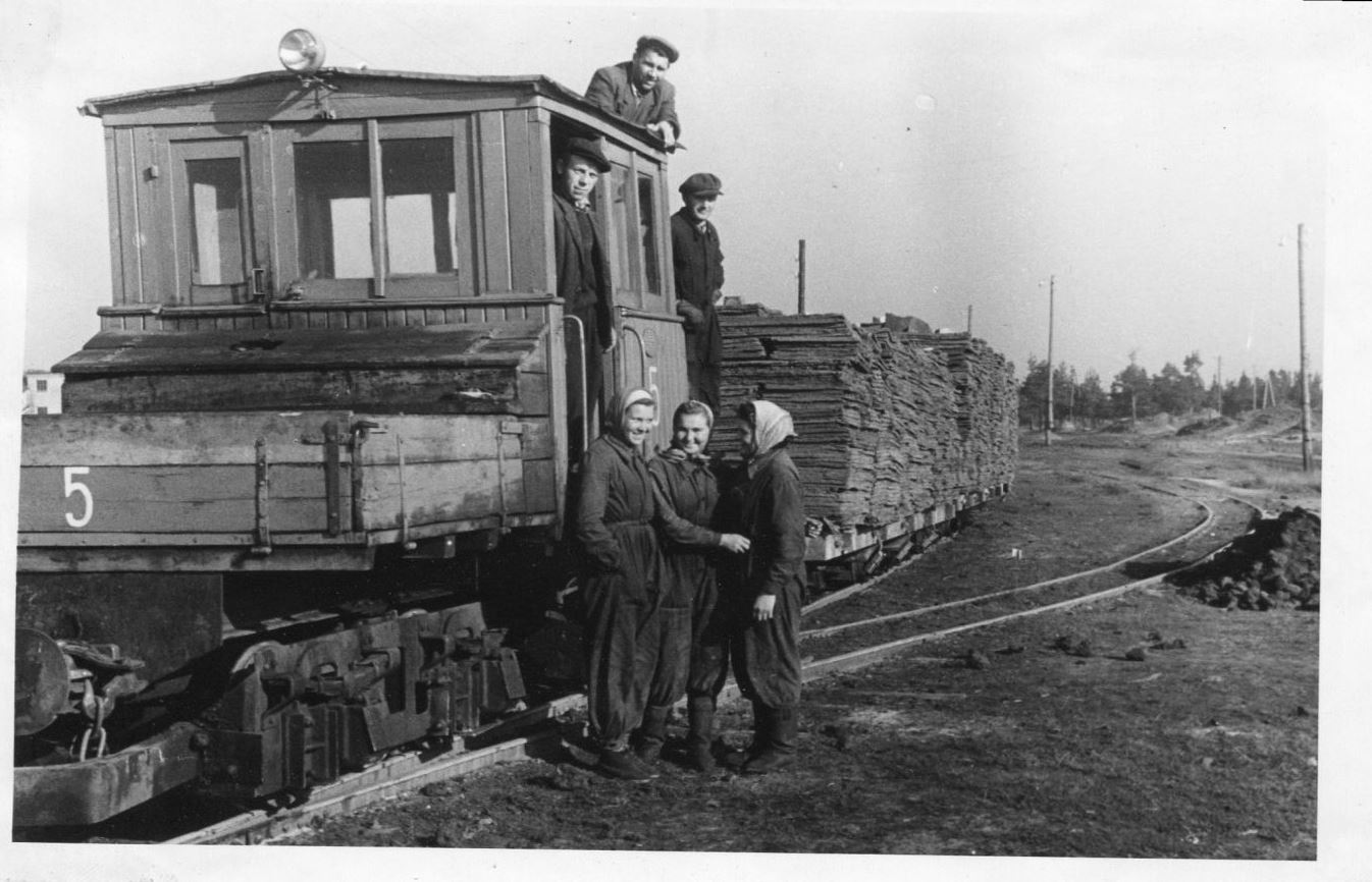 Baložu kūdras fabrikas strādnieki transportē izoplates ar lokomotīvi (motovozu).