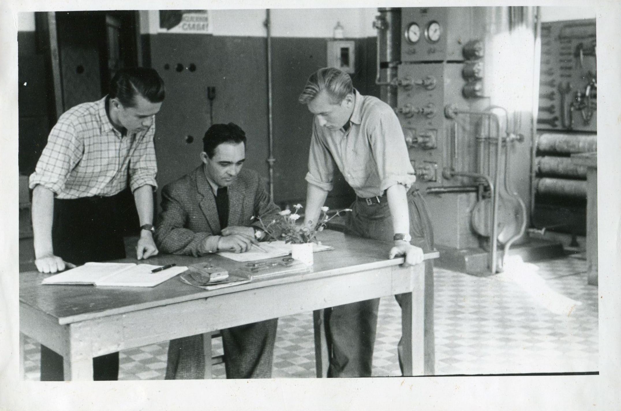 Komunistiskā darba ceha priekšnieks I.Veide sarunā ar ceha jauniešiem Masļennikovu un Sergejevu.