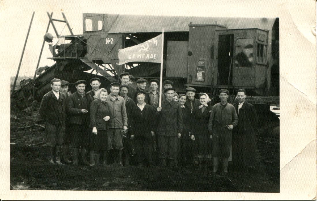 Fonā redzama kūdras ieguves mašīna TEMP 2. Vīrietim rokā karogs ar nosaukumu "Передовой бригаде" [pirmrindas brigādei].