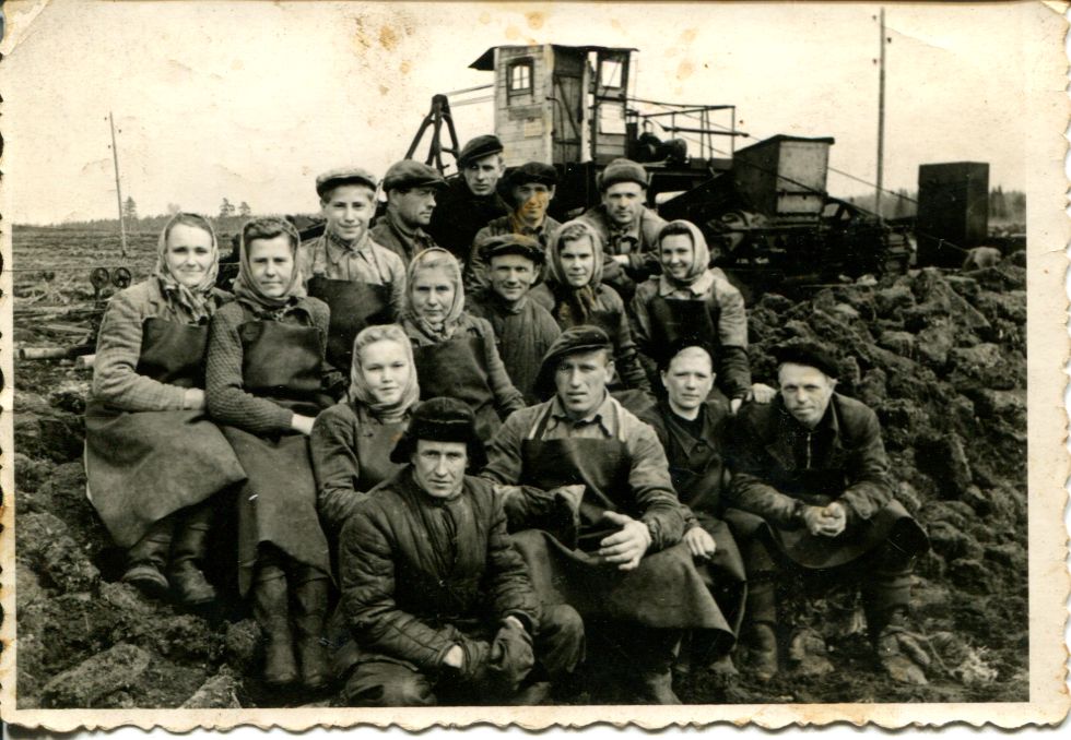 Kūdras ieguves brigāde atpūtas mirklī kūdras laukā.