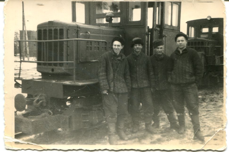 Baložu kūdras fabrikas mašīnisti pie lokomotīves (motovoza)
