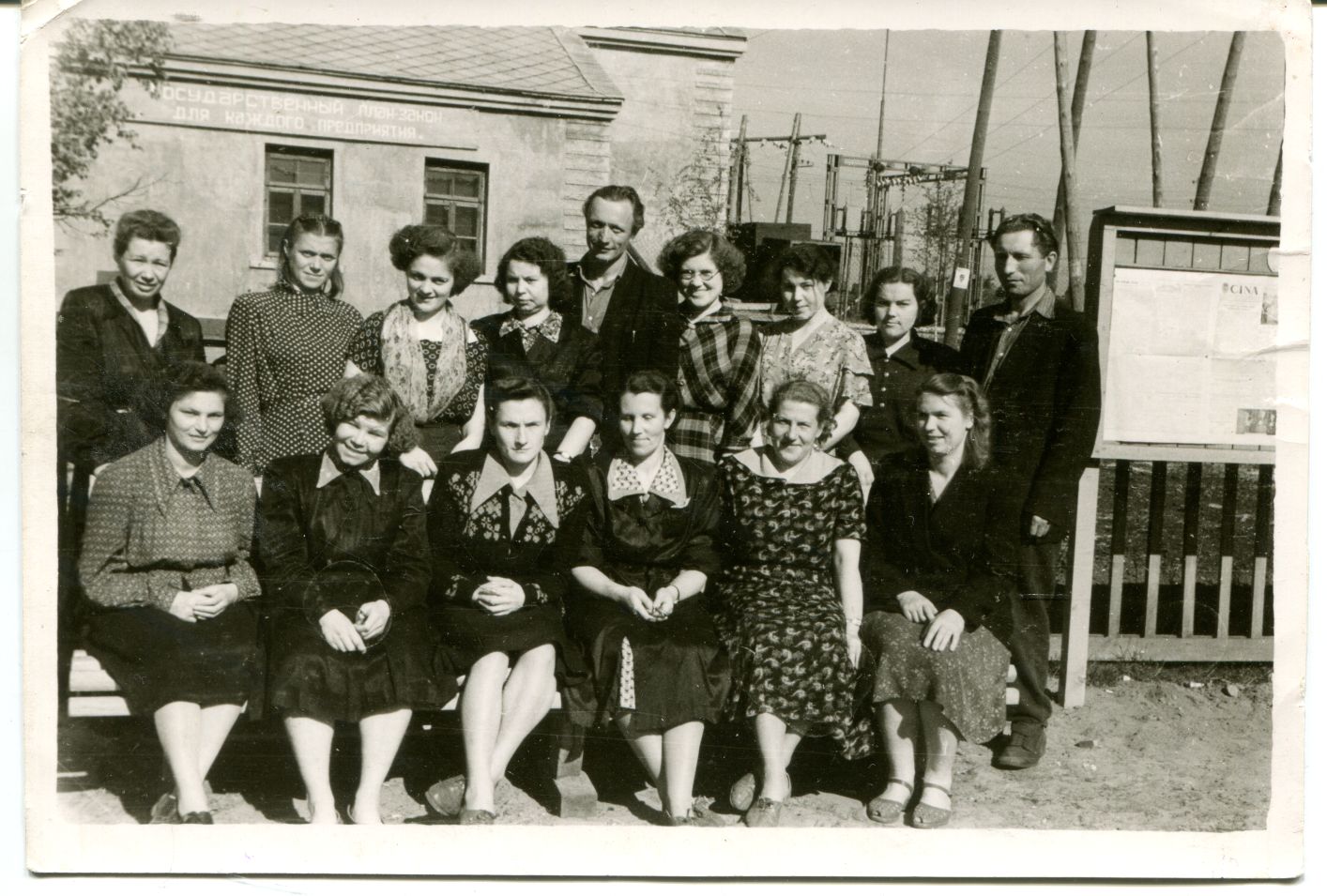 Baložu kūdras fabrikas kantora darbinieki. Aizmugurē redzama ēka un stends, uz kura ir izvietota avīze "Cīņa". Pirmajā rindā no kreisās Gaida Šemele, Marija, Anastasija Strupoviča, Zālīte, Zinaīda Fogele, Olga Černova. Otrajā rindā no labās: Jānis Seleckis, Malvīne, Alla Pirogova, Zoja Savina, Arnis Kvilis, Raisa Kravčenko.