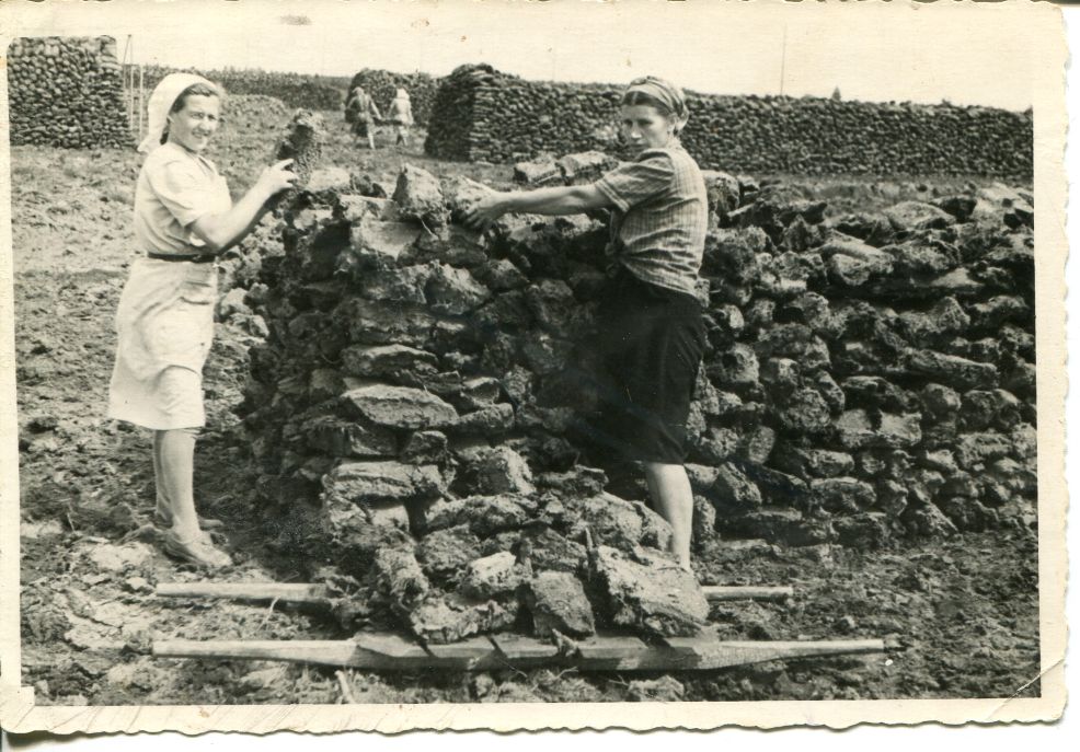 Priekšplānā kūdru no nestuvēm grēdā krauj divas sievietes. Pirmā no kreisās - Monika Greivule. Fonā redzamas sakrautās kūdras grēdas (štābeļi), vēl divas sievietes nes kūdras gabalus uz nestuvēm.