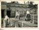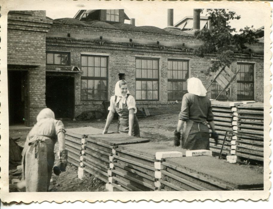 Priekšplānā trīs sievietes liek izoplates grēdā un sagatavo žāvēšanai izoplašu cehā. Noliekusies pirmā no kreisās - Monika Greivule. Fonā Baložu kūdras fabrikas izoplašu cehs.