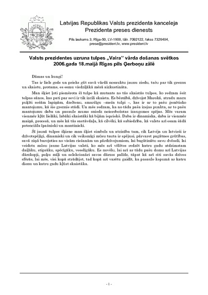 Valsts prezidentes uzruna tulpes „Vaira” vārda došanas svētkos 2006.gada 18.maijā Rīgas pils Ģerboņu zālē