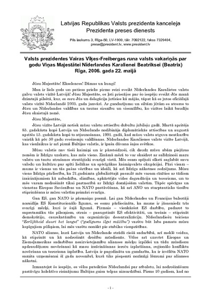 Valsts prezidentes Vairas Vīķes-Freibergas runa valsts vakariņās par godu Viņas Majestātei Nīderlandes Karalienei Beatriksei (Beatrix) Rīga, 2006. gada 22. maijā