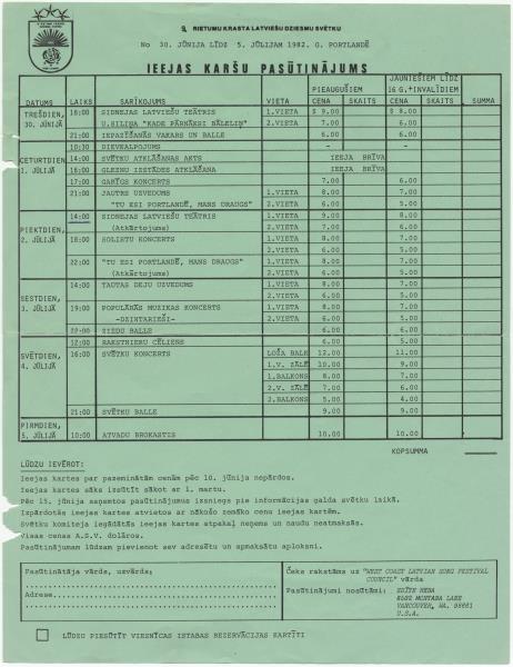 9. Rietumu krasta Dziesmu svētku no 30. jūnja līdz 5. jūlijam 1982.g. Portlandē ieejas karšu pasūtinājums