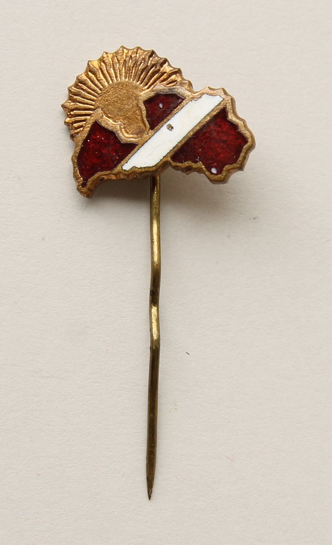 Nozīmīte ar Latvijas kartes kontūru karoga krāsās un sauli, [198-]