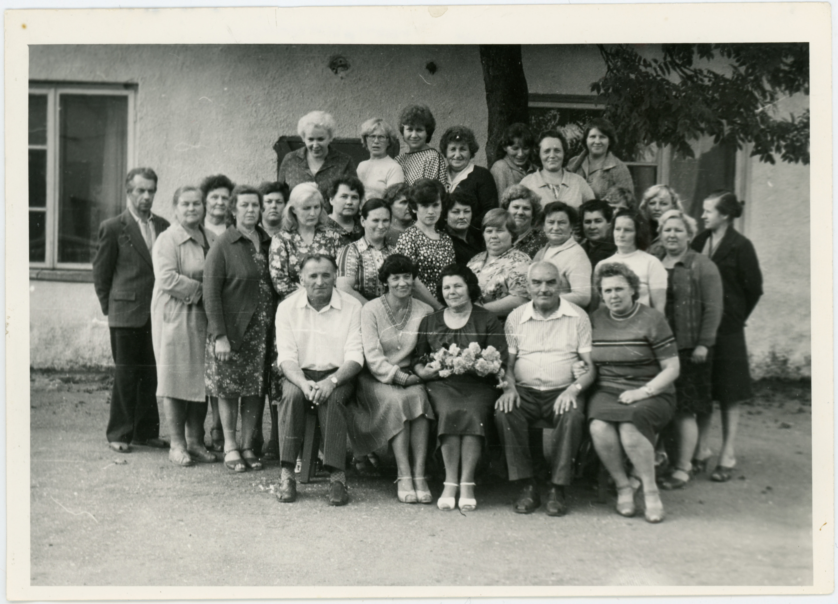 Kādas kolēģes sveikšana Gulbenes ceha ēkas iekšpagalmā. Pirmajā rindā otrais no labās sēž ceha priekšnieks Stepans Strojevojs