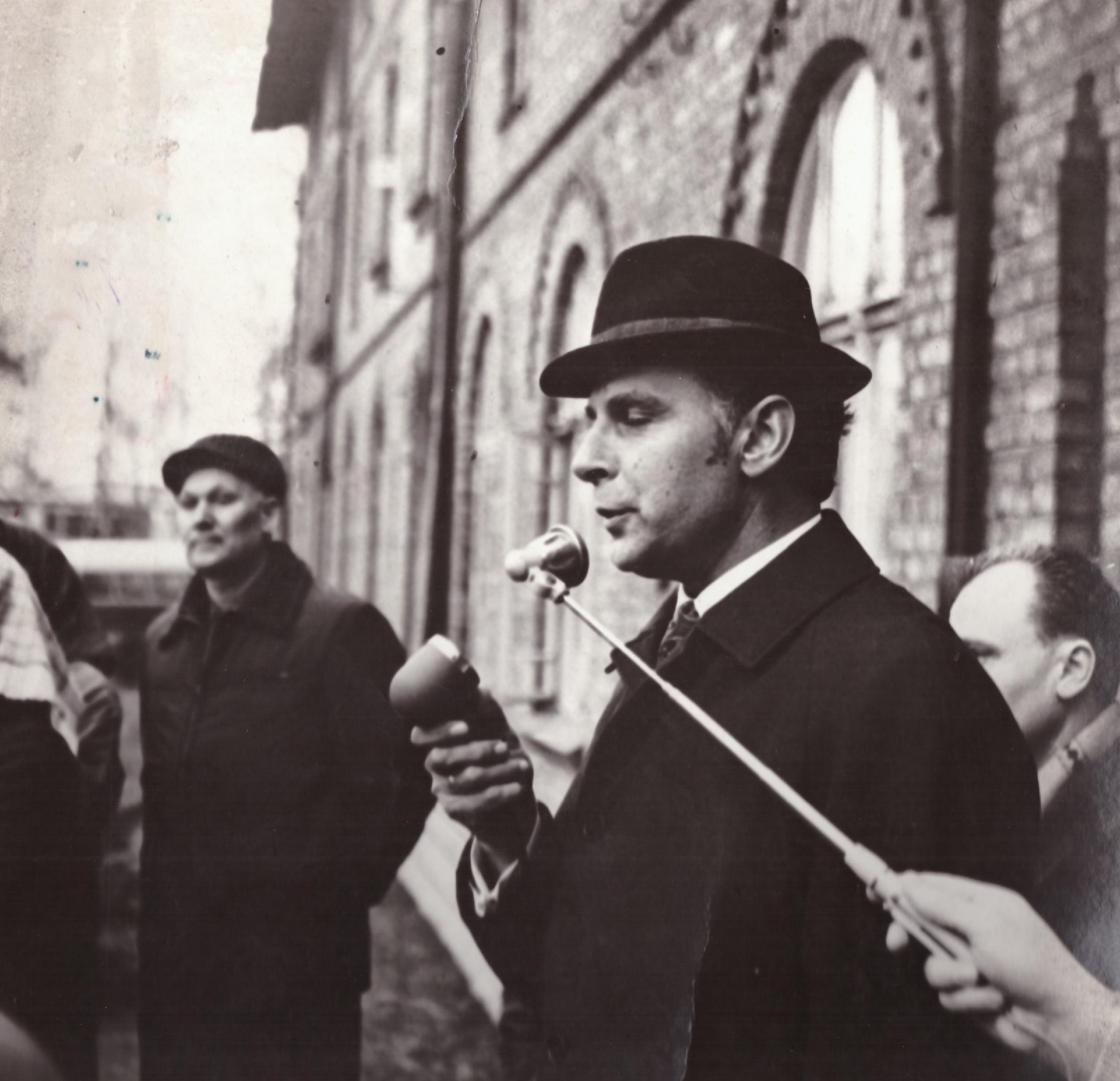 Slokas CPK galvenais inženieris Maigonis Ameizers saka uzrunu mikrofonā strādniekiem fabrikas pagalmā. Maigonis Ameizers bija Slokas CPK galvenais inženieris no 1964. - 1973.gadam.