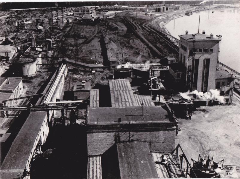 Skats uz papīrfabrikas teritoriju no augšas - redzamas ēkas un Lielupes krasts