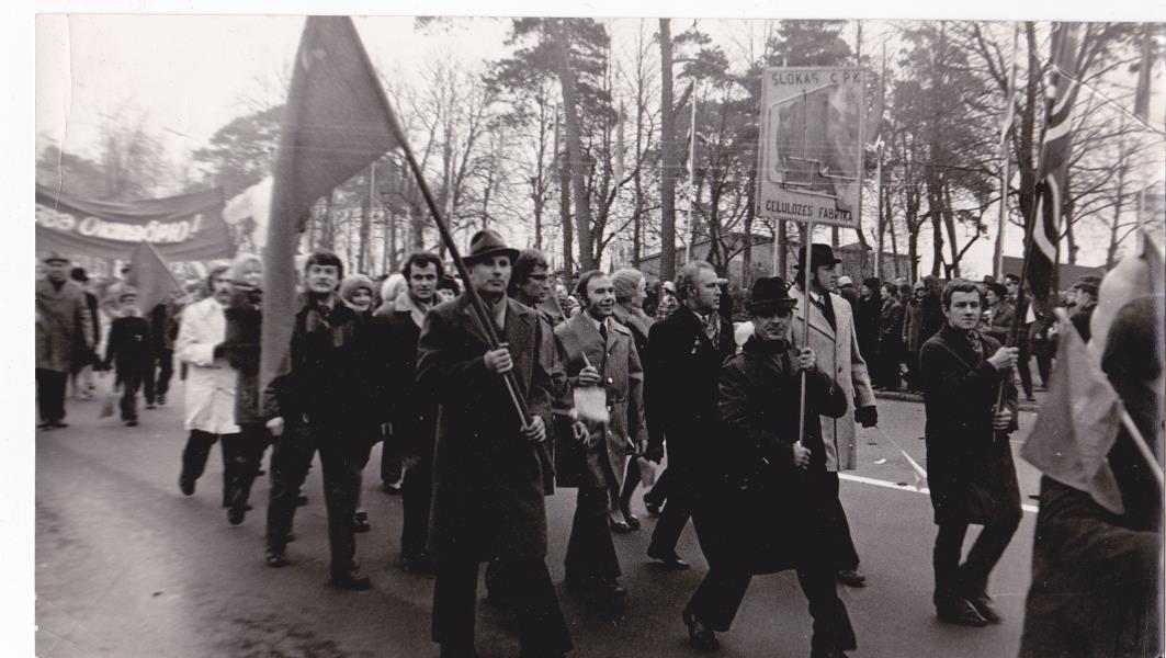 Fabrikas pārsāvji iet kolonnā Lielās Oktobra sociālistiskās revolūcijas gadadienai veltītā darbaļaužua svētku gājienā pa Jūrmalas ielām.