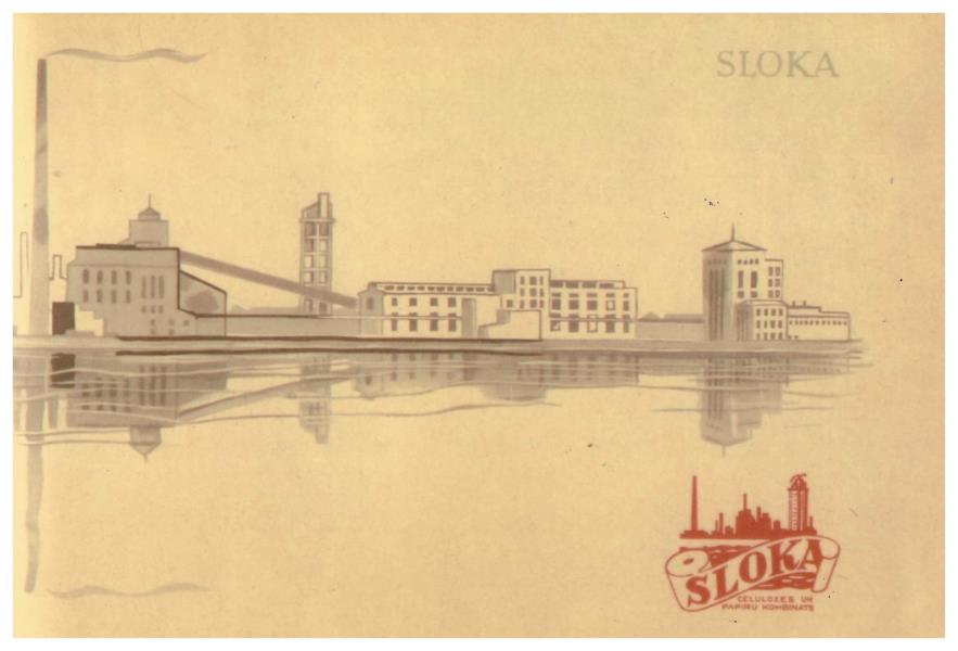 Uz gaiši dzeltena fona Slokas CPK ēku stilizēts siluets. Ēku atspulgs Lielupē, labajā apakšējā stūrī sarkana Slokas CPK emblēma , labajā augšējā stūrī blāvs uzraksts: Sloka.