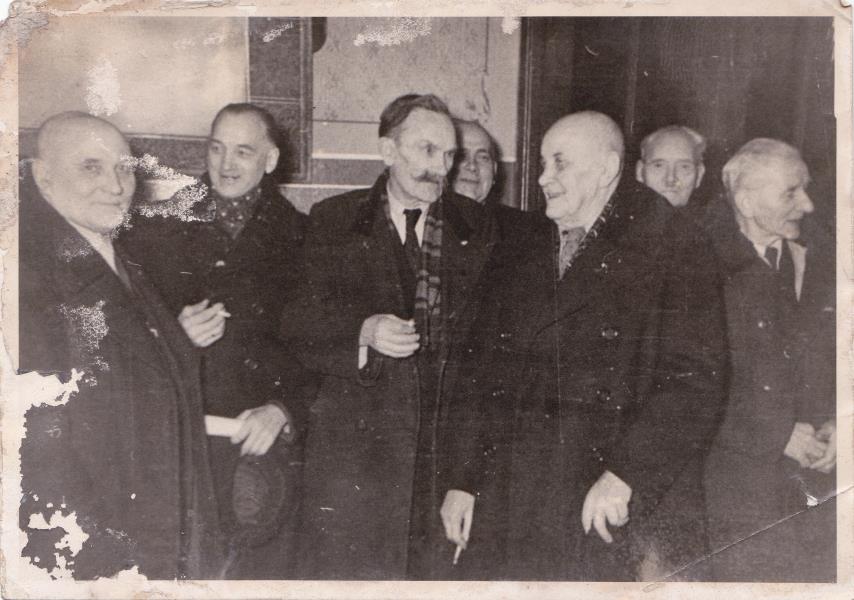 Pēc darba veterānu godināšanas pasākuma grupa veterānu stāv foajē. No kreisās papīra masas vecākais sagatavotājs J. Krimelis, vecākais mašīnlaidējs Buholcs, kalējs V.Sirsons, atslēdznieks V.Sējāns.