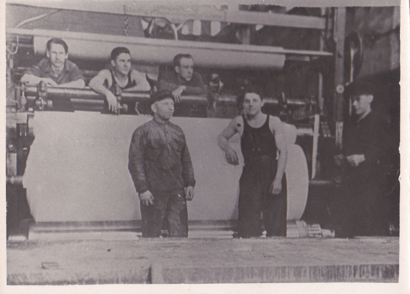 Baltijas Celulozes fabrikas strādnieki stāv pie papīrmašīnas, kur top jauns papīra rullis - viņu roku darba rezultāts.