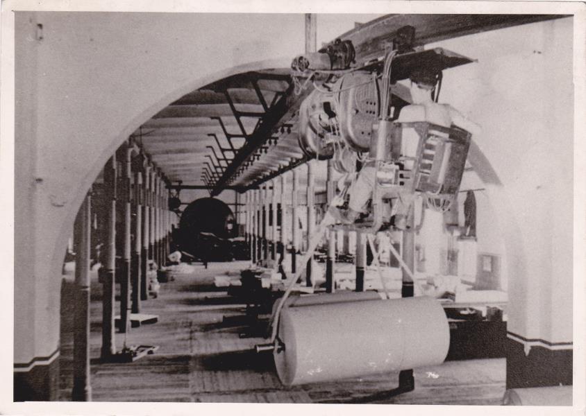 Fabrikas iekšsksts - strādnieks transportē gatavo produkciju - iekārtu papīra rulli pa griestu sliežu līniju.