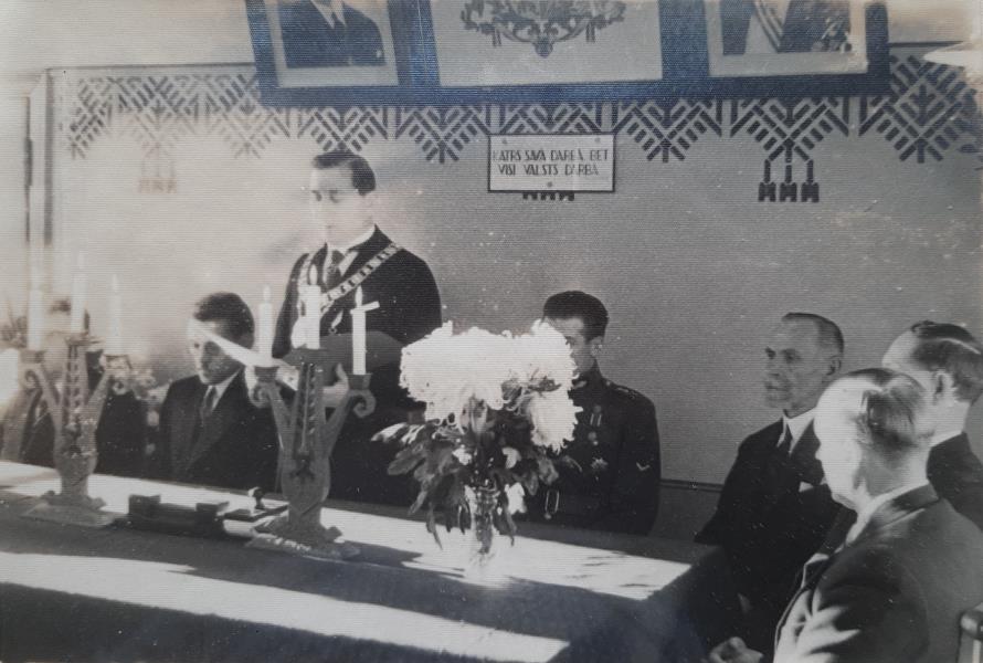 Latvijas Valsts 20 gadu jubilejas svinīgā sēdē Slokas pilsētas valdē. Pie sienas Kārļa Ulmaņa un Jāņa Baloža foto, Latvijas ģerbonis. Sēdes dalībnieki izkārtojušies gar galdu, Slokas pilsētas galva Rūdolfa Kundziņš stāv un lasa svinīgo uzrunu, Vilhelms Z