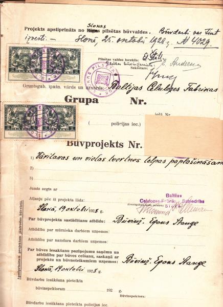 Slokas pilsētas būvvaldes apstiprināts būvprojekts: Vārītavas un vielas tvertnes paplašināšana. Redzams Slokas pilsētas valdes zīmogs un atbildīgo ierēdņu paraksti, kā arī BCF zīmogs un atbildīgo paraksti.