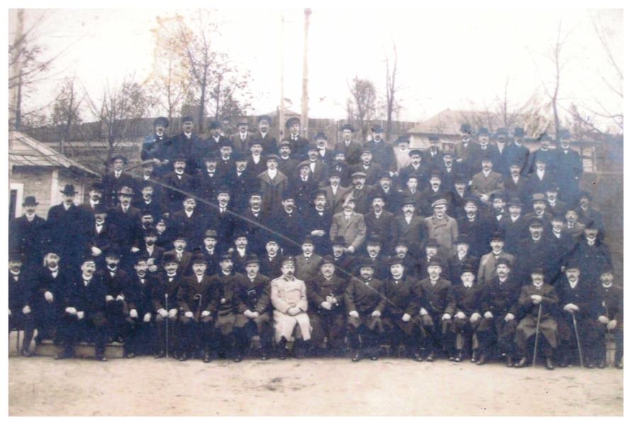 Fabrikas vadītāji un meistari sēž un stāv 6 rindās. Vīrieši svinīgi uzposušies, cepurēm galvās, kaklasaitēs.