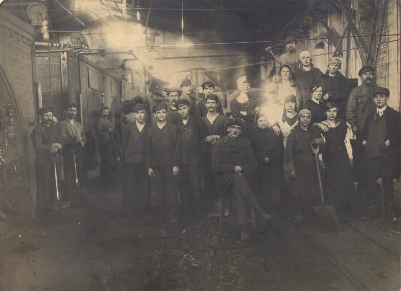 Baltijas Celulozes fabrikas ogļu (katlu mājas) iekšskats. Strādnieku grupa ar lāpstām, priekšplānā ogļu kaudze.