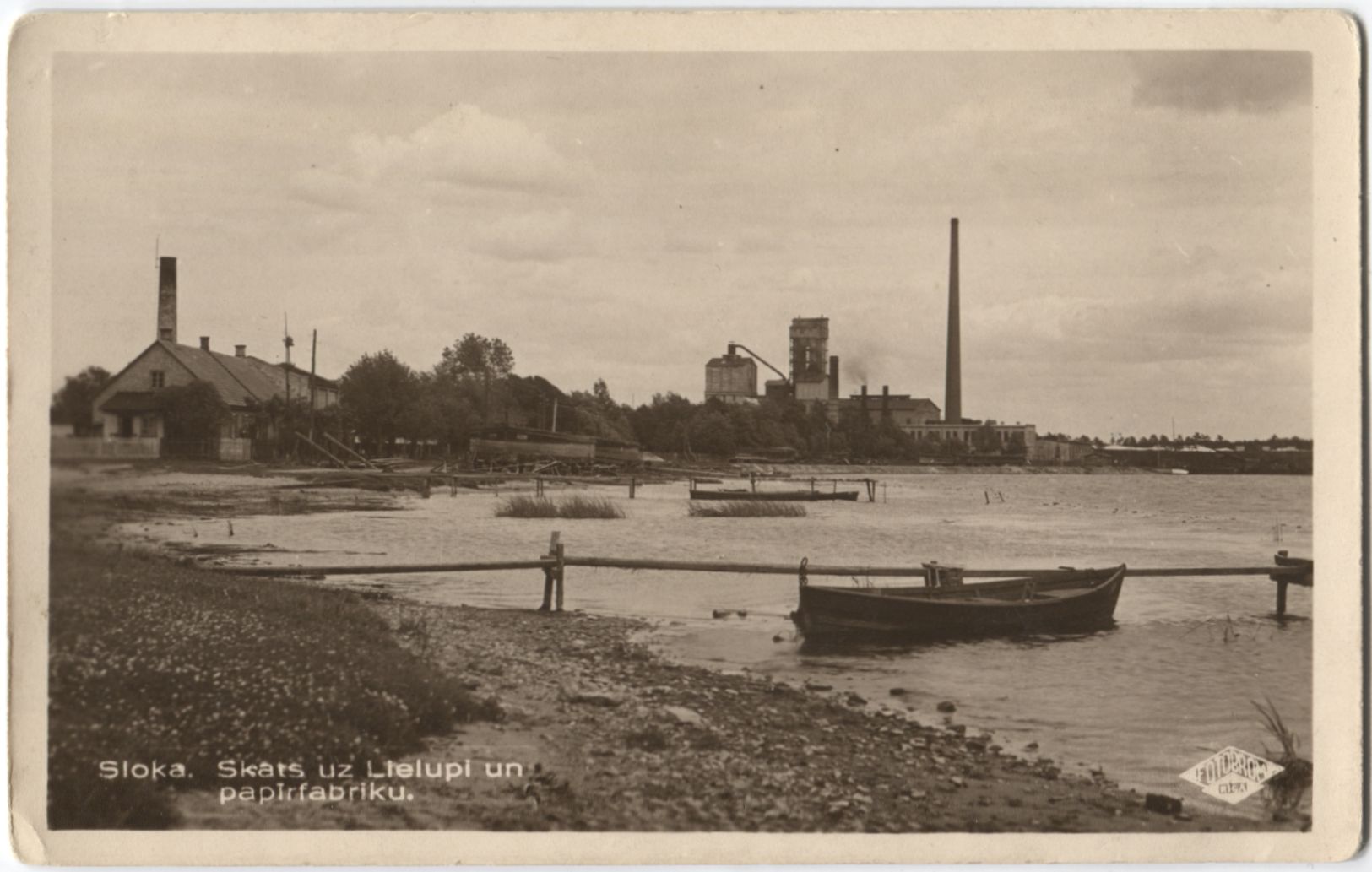 Centrā fabrikas ēkas. Labajā pusā Lielupes krasts ar laivām. Kreisajā pusē uzraksts: Sloka. Skats uz Lielupi un papīrfabriku.Labajā pusē zīme: FOTOBROM.RĪGA.