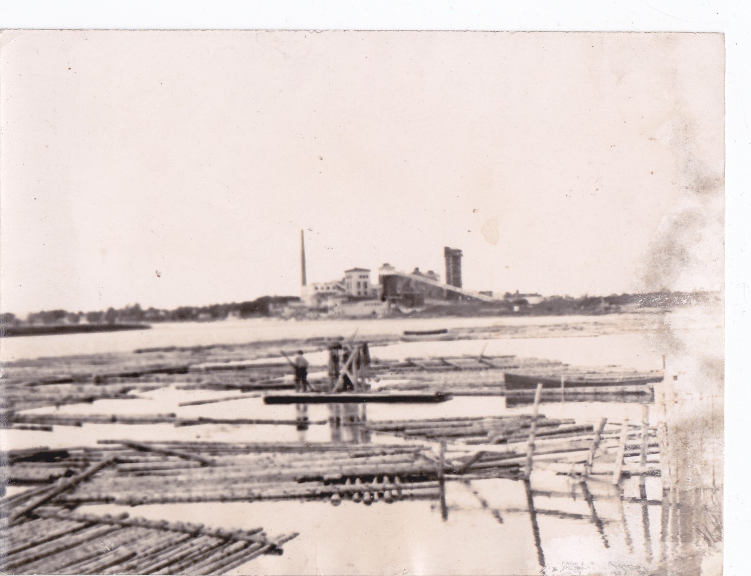 Priekšplānā Lielupe ar lielu daudzumu baļķu, centrā cilvēks uz plosta, blakus laiva. Tālumā redzamas fabrikas ēkas un lielais skurtenis.