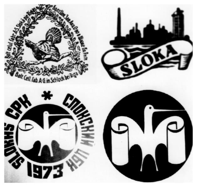 4 Slokas celulozes un papīra rūpnīcas emblēmas - preču zīmes, kas tapušas un lietotas dažādos laikos