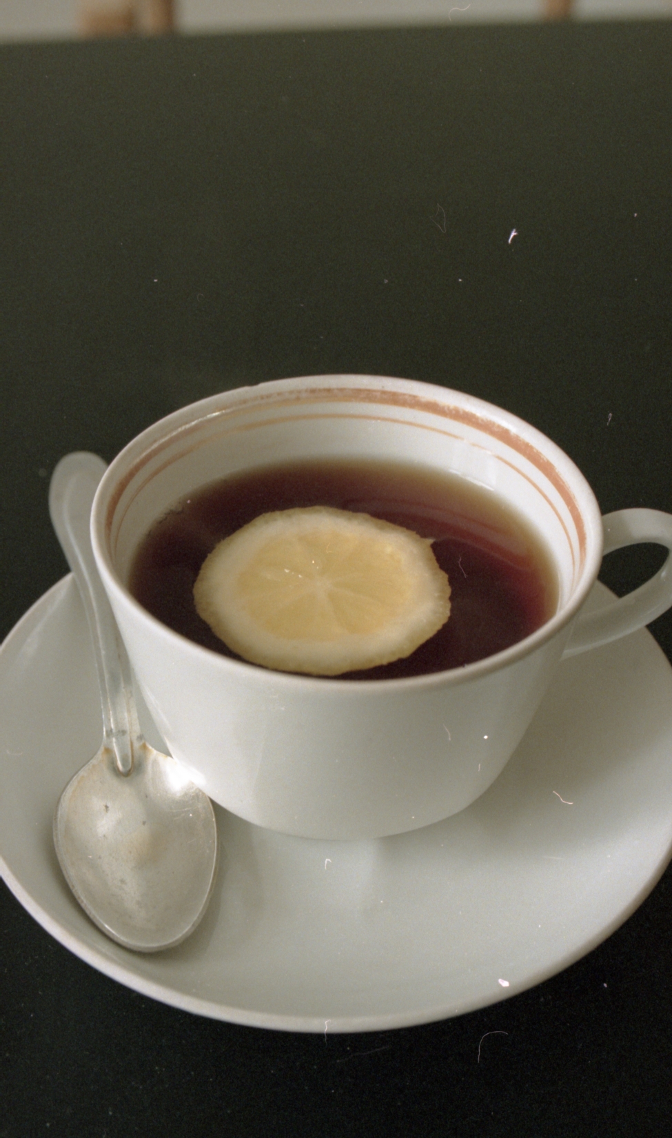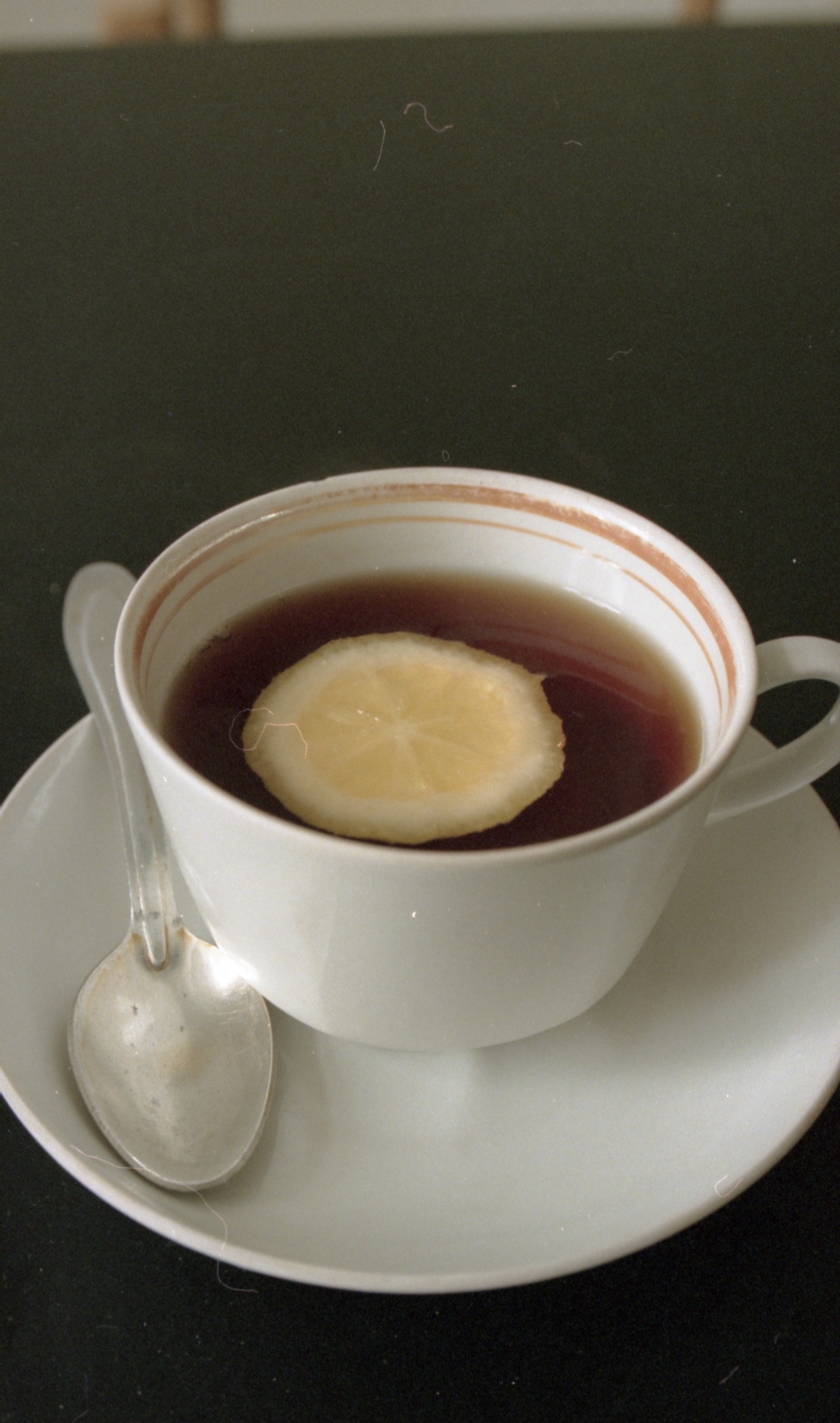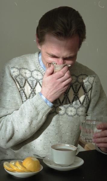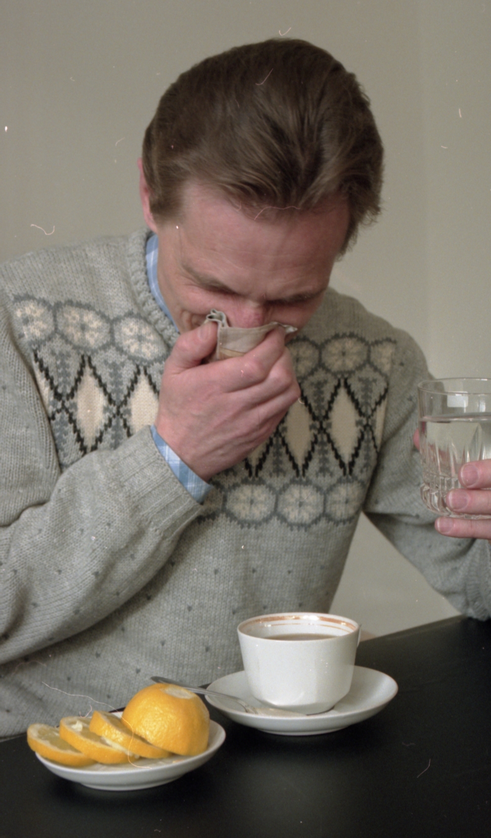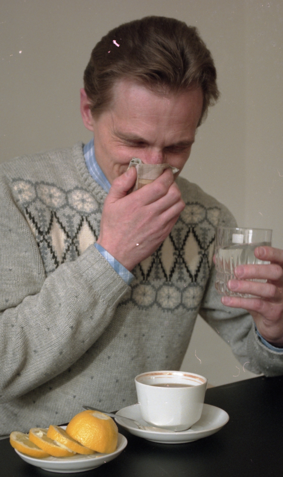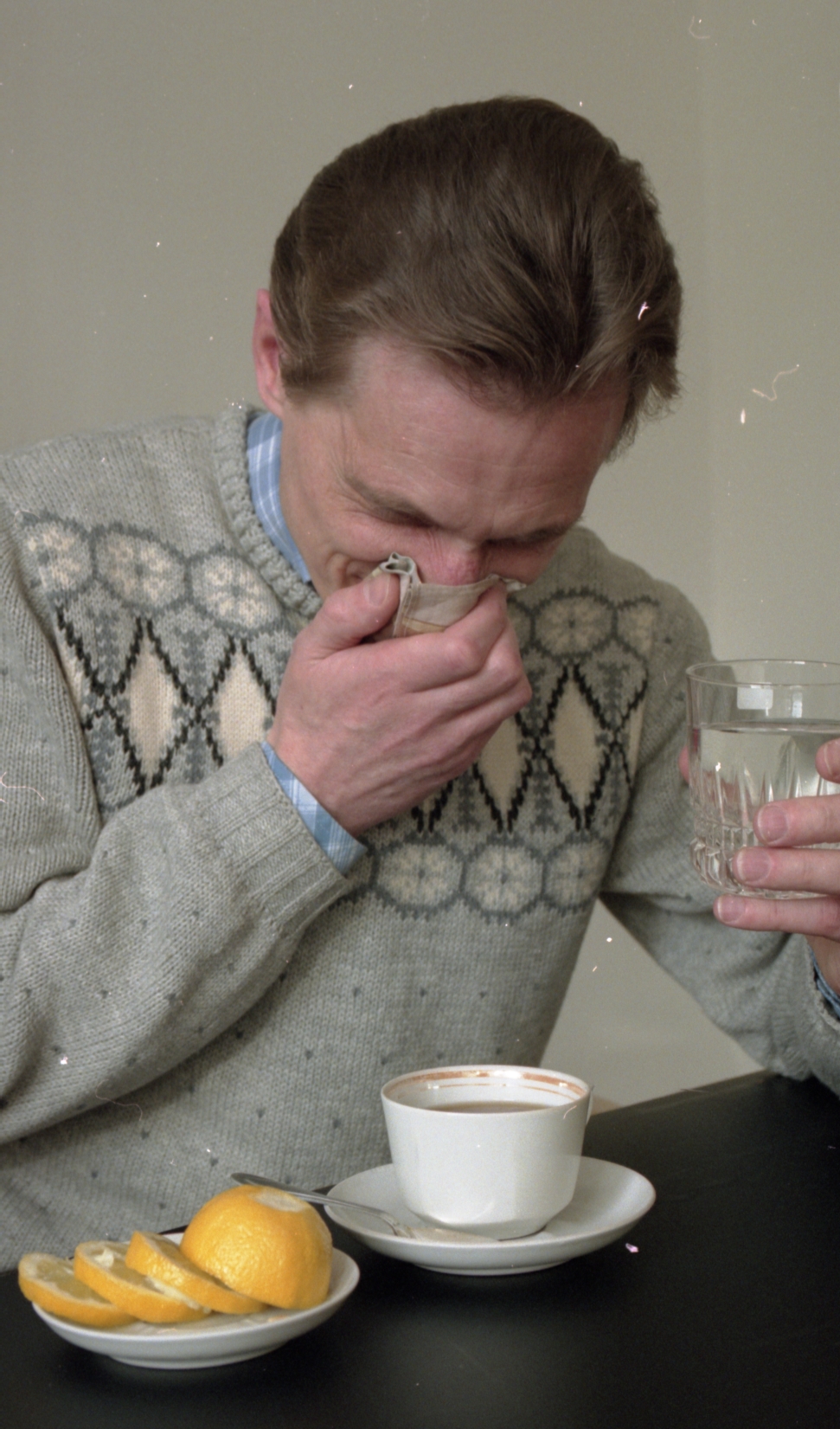 Tēja ar citronu. Žanra bilde par iesnām. Raitis.